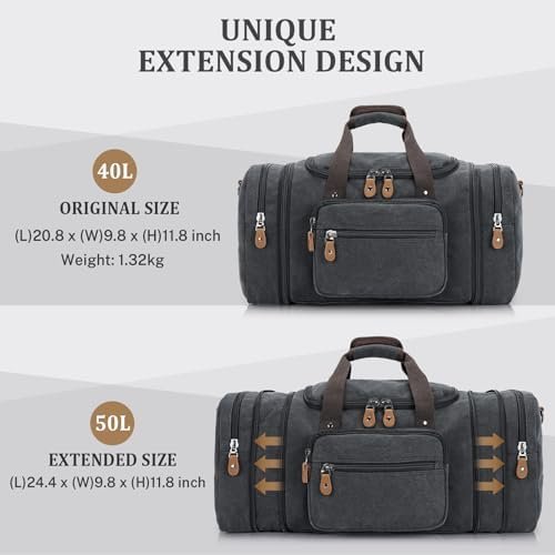 Expandable design: The Canvas Travel Duffel Bag measures (L)20.8 x (W)9.8 x (H)11.8 inches and can be extended to 24.4 inches with two side zippers. Perfect for carrying on flights as carry-on luggage